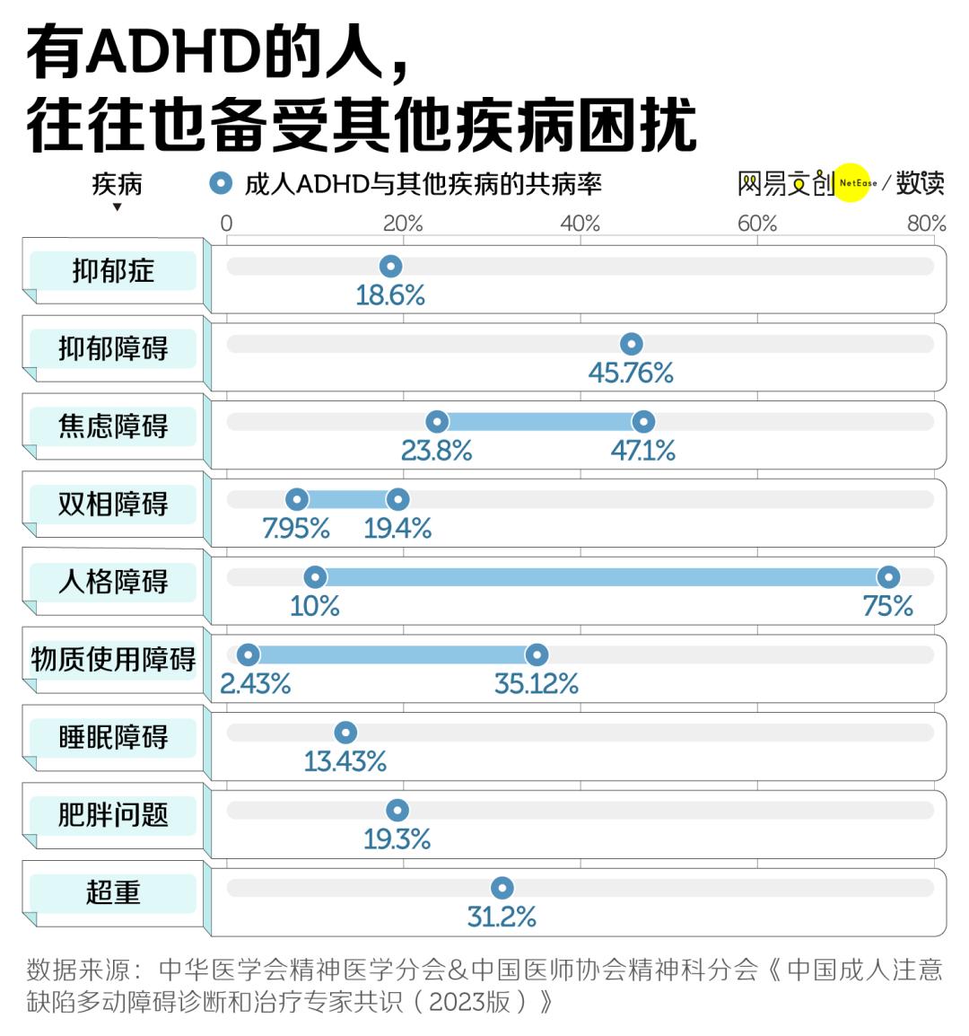 2023年,根据《中国成人注意力缺陷多动症诊断与治疗专家共识》 版本),很多成年人 ADHD 病人还会同时遭受抑郁、焦虑、失眠等疾病的困扰,甚至会增加自杀的想法和行为。 [9]。