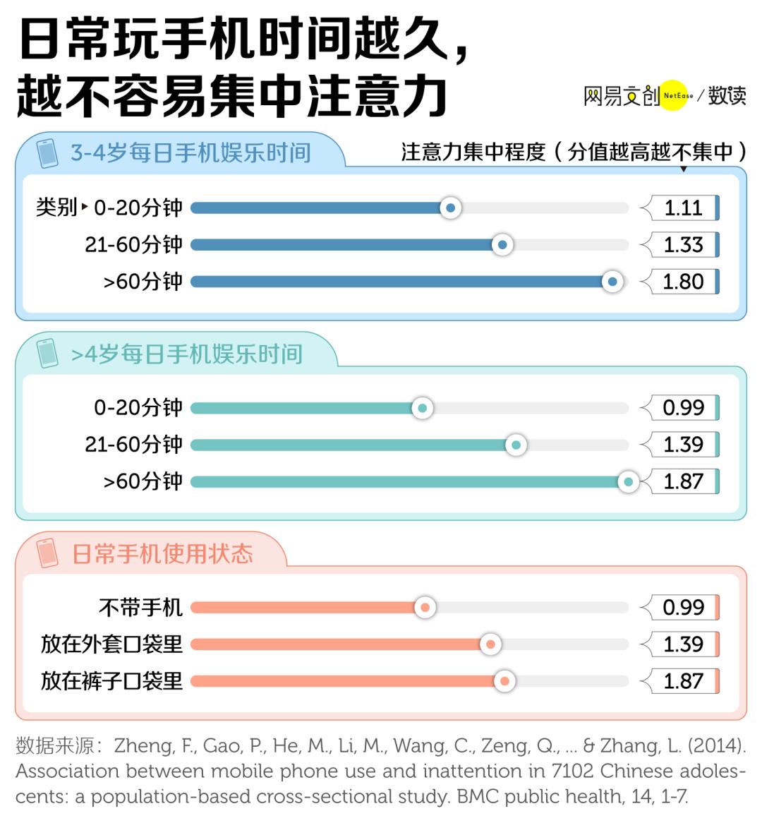 面向中国的一个项目 7000 一些青少年的研究表明,每天玩手机超过了 60 分钟显然与注意力不集中有关。如果使用更多的电子产品,不仅会带来抑郁的风险,还会随着屏幕使用时间的增加而降低人类的认知功能和注意力。 [14]。