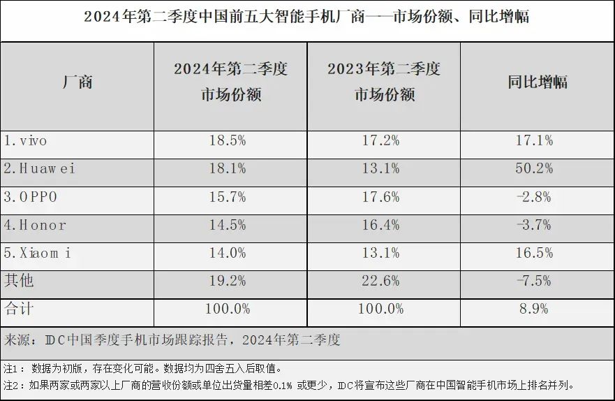 然而,第三季度,由于iPhone16系列的发布,苹果又回到了前五名,市场份额为15.6%。