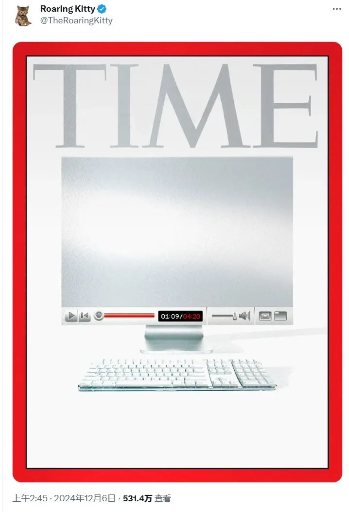 这条推文是在周四, 《咆哮小猫》在《时代》杂志的封面上贴了一张照片,上面有一个空白的电脑屏幕,显示了视频播放器的页面。电脑屏幕下显示的视频时长为4分20秒,播放时间为1分09秒。