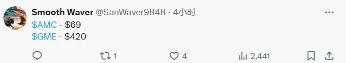 在他看来,69和420这两个数字可能暗示着“咆哮小猫”给两只最受欢迎的Meme股票的目标价格——AMC上涨到69美元(截至周四收盘5.2美元),GME上涨到420美元(截至周四收盘28.63美元)。