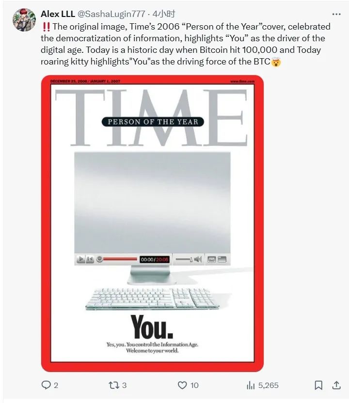 这个网友认为,这张图的关键意思是庆祝信息民主化,强调普罗大众是数字时代的推动者,而BTC周四恰好是历史性的一天,达到了10万美元。因此,“咆哮小猫”想要传达,“你”是比特币的推动者。