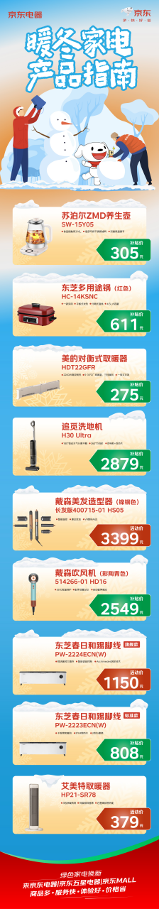 “供暖产品的消费叠加国补,专注于美的、格力、艾美特等知名品牌供暖器,是近期销量最热的;飞利浦,年轻人更喜欢,COLMO、美的等品牌即热饮水机也逐渐旺销。“京东电器南京新街口店导购员透露,比如苏泊尔高硼硅玻璃养生壶SW-15Y05,采用316L食品接触,双保温调节,国补价305元;东芝HC-14KSNC红色多功能料理锅,分体式盘体4.5升多功能多功能锅火锅烧烤一体,国补价611元;三档暖风,2200W高效制暖美的对衡式暖气HDT22GFR,国补价275元;180°平躺恒动水蒸气分离H300 Ultra 旋锋版无线智能家用洗衣机,国补2879元;55℃恒温护理戴森 (DYSON) HD16吹风机彩陶蓝色,国补2549元;IPX4级防水,U型石墨烯东芝春日和标准PW-2223ECN(W),国家补价808元;新鲜暖风大循环东芝春日及旗舰款PW-2224ECN(W),活动价格1150元;戴森智能温控 (DYSON)美发造型旗舰套装 HS05,活动价格3399元;艾美特加热器HP21-SR78,三档冷暖双用,母婴级抑菌率,活动价格379元...都值得入手。