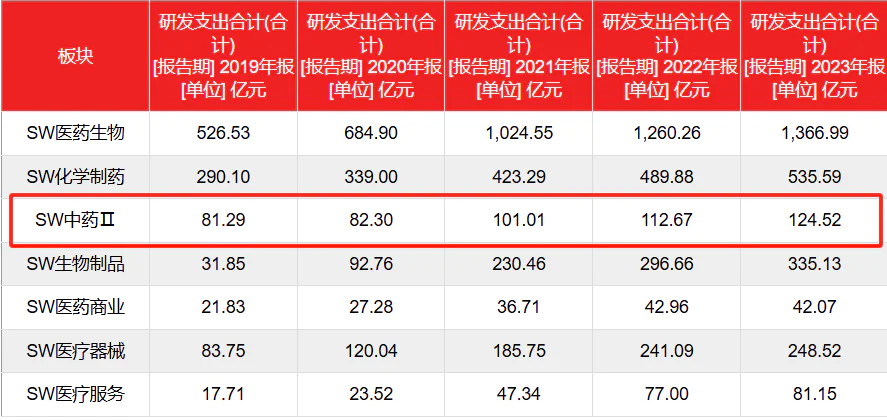2023年上市的中药企业研发费用仅为124.52亿元,为化学药品的23.25%。、37.16%的生物药物、医疗器械的50.10%,占医药行业R&D总费用的9.11%。由此可见,中药行业是所有医药制造业中R&D投资最少、技术水平最弱的板块。