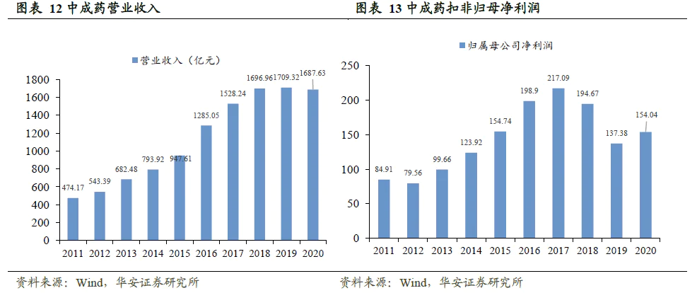 这一褒贬不一的观点使得中药企业同样处于尴尬的境地。特别是2018年以后,国家开始大刀阔斧地改革药品行业的供给侧,医疗保险基金开始“换鸟”,医疗保险资金从仿制药向创新药物倾斜。中药产业的发展在国家全力支持创新药物发展的大环境下陷入了停滞状态。2018-2020年间,中国经济处于高景气状态,人口老龄化趋势也增加了对药品的需求。但上市中成药企业收入停滞不前,利润甚至逐渐下降。
