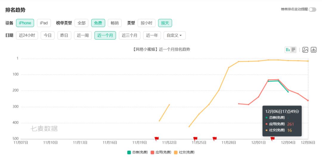 据七麦数据显示,自上线半个月以来,IOS端网易蜜蜂在“社交”类别中排名第九,目前保持在15位左右。从下载量估计来看,最近一周日平均下载量为1.2万次。