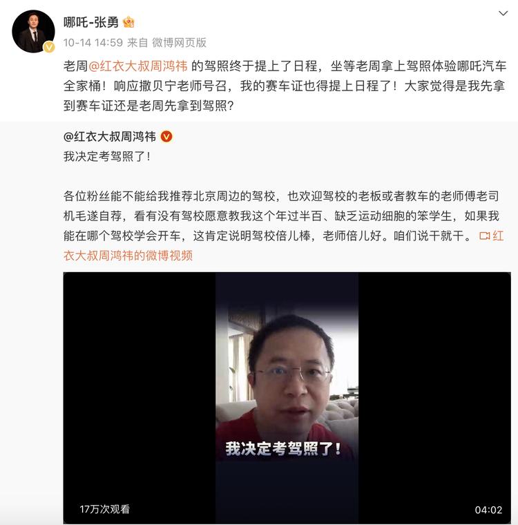 10月14日,张勇的微博与周鸿祎考驾照有关。
