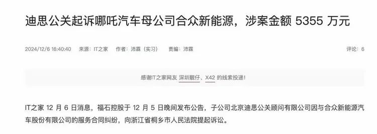 迪思公关起诉哪吒汽车,合同纠纷金额达到 5355 万元。