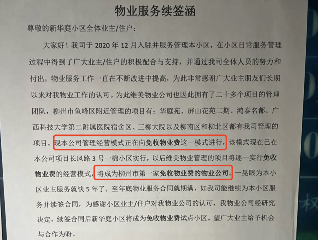柳州维美物业服务有限公司(以下简称维美物业)是《物业服务续签函》的署名单位。内容显示,公司于2020年12月进驻并服务管理新华庭社区,物业服务合同于今年年底到期。