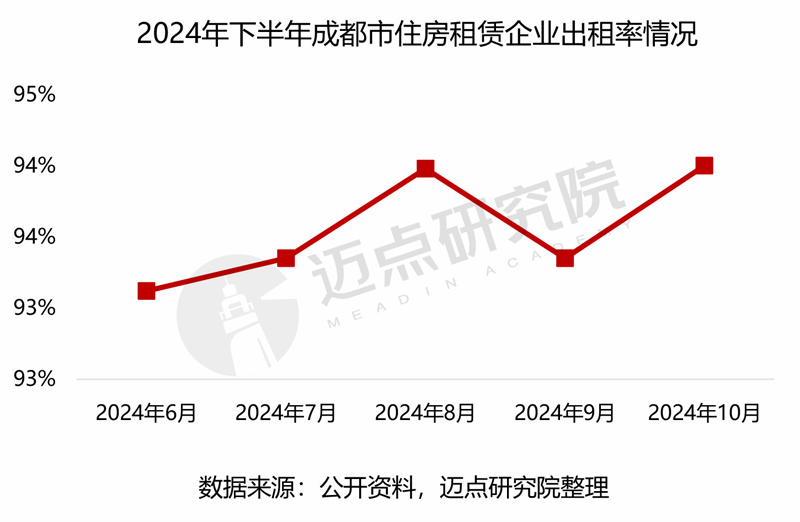 2024年下半年,成都市住房租赁企业出租率普遍稳定,在93%-94%之间,其中毕业季出租率持续上升。以深耕成都的保利和寓为例,2024年1-8月营业项目平均出租率为99%,2024年8月底新开的天环店二期和爱尚里二期店开业率为99%。