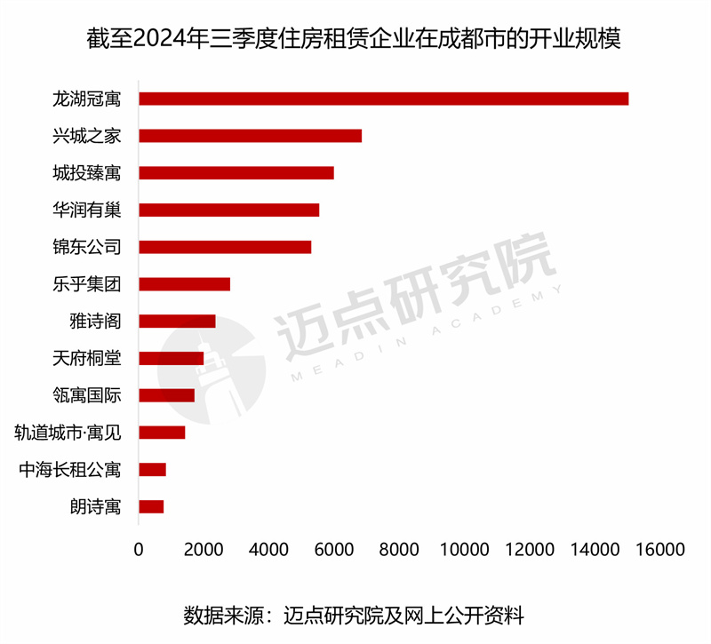 从企业开业规模来看,截至2024年第三季度,龙湖冠寓在成都市领先15041套开业住房,市场份额排名第一;锦东公司、华润有巢、城投真寓、兴城世家位于5000-7000套,其中锦东公司、城投真寓、兴城世家均为成都本土国企;此外,乐乎集团、雅诗阁、天府桐堂、路轨城市、寓见等住房在3000套以内。