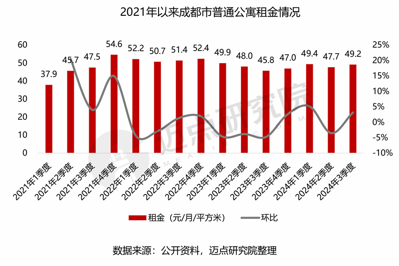 成都市一般公寓租金在2021-2024年第三季度呈波动趋势。2021年租金持续增长,达到近年来最高值(每月54.6元/平方米)。从2022年开始,租金水平相对稳定,涨跌幅度基本控制在5%以内,其中2024年租金约为49元/月/平方米。