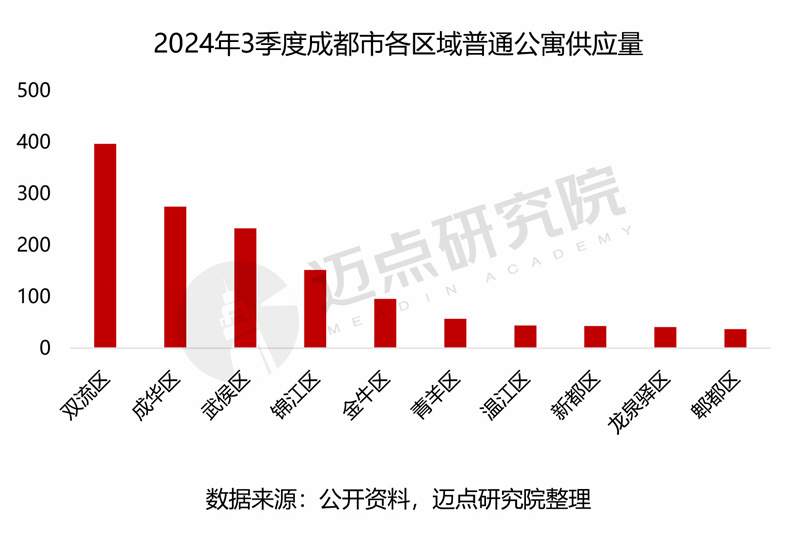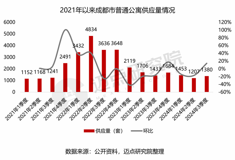 成都市普通公寓供应在2021-2024年第三季度大幅波动,2021年第四季度涨幅达到100.7%,2023年第一季度跌幅达到41.9%。从2024年开始,三个季度的供应量近年来处于较低水平,第一季度和第二季度各自下降了13.7%、第三季度,在季节性因素的影响下,16.9%的供给增加了14.3%。