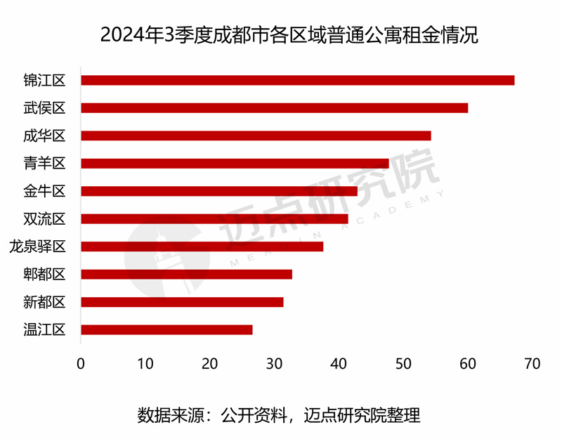 就地区而言,锦江区和武侯区的租金水平位居成都市第一梯队,超过60元/月/平方米;双流区、金牛区、青羊区、成华区的租金水平位于40-55元/月/平方米;温江区、新都区、郫都区、龙泉驿区的租金水平相对较低,低于40元/月/平方米。