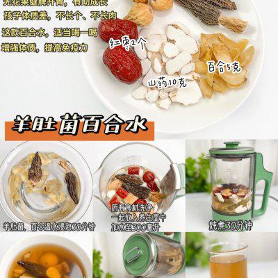 6、✅羊肚菌百合水 配料准备:无花果 3 个,羊肚菌 2 个,大枣 2 个,百合 5 克,山药 10 克