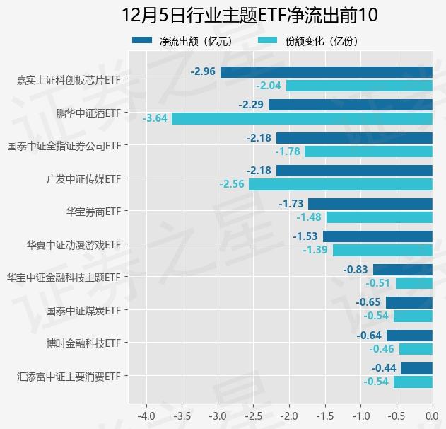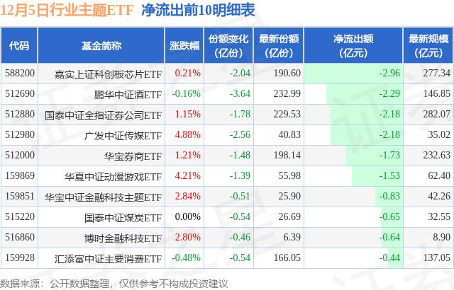 当天有 126 只行业主题 ETF 资金净流出,其中嘉实上证科技创新板芯片净流出排名第一。 ETF(588200),份额下降 2.04 一亿份,净流出额为 2.96 亿元。