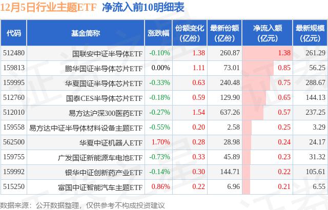 证券之星消息,12 月 5 日行业主题 ETF 总资金净流出基金 12.96 亿元,近 5 一个交易日累计净流入 18.13 亿元,5 在一个交易日内,出现了日合计资金净流入。 4 天(ETF 计算资金流入的方法:(当日 ETF 现场流通份额 - 前一交易日 ETF 现场流通份额)* 当天 ETF 均价,数字仅供参考)。