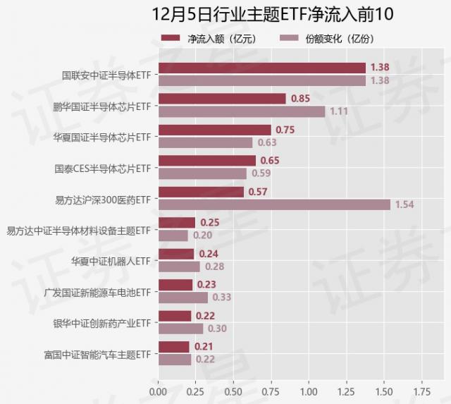 当天有 92 只行业主题 ETF 资金净流入显示,其中国联安中证半导体净流入排名第一。 ETF(512480),份额增加 1.38 十亿份,净流入额为 1.38 亿元。
