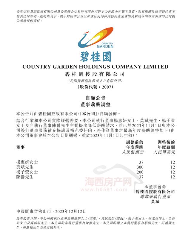 海西房地产网(微信微信公众号:fjhxfcw)消息:12 月 12 一天晚上,碧桂园发布了一份关于董事薪酬调整的公告。