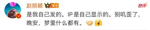 也有粉丝质疑赵丽颖的动态不是我发的。因为IP地址显示在北京,赵丽颖在评论区补充道:“是我自己发的。IP是我自己展示的。别傻了,晚安,梦里什么都有。”