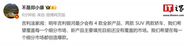 IT 世家 12 月 6 据博主介绍,每日消息 @不是郑小康 新闻,吉利汽车集团 CEO、根据吉利汽车控股有限公司执行董事的家阅,明年吉利银河至少会有 4 全新产品,两款 SUV 两款轿车。