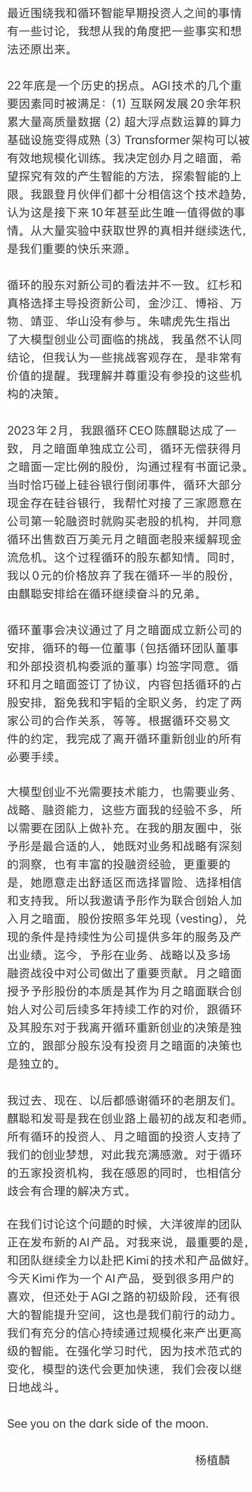 3、循环董事会决议通过月亮暗面新成立公司的安排,每位董事都签字同意。循环与月亮暗面签订协议,涉及循环占股安排、免除杨植麟和张宇韬的全职责任、两家公司的合作关系达成一致。根据协议,杨植麟完成了离开循环再次创业的所有必要程序。