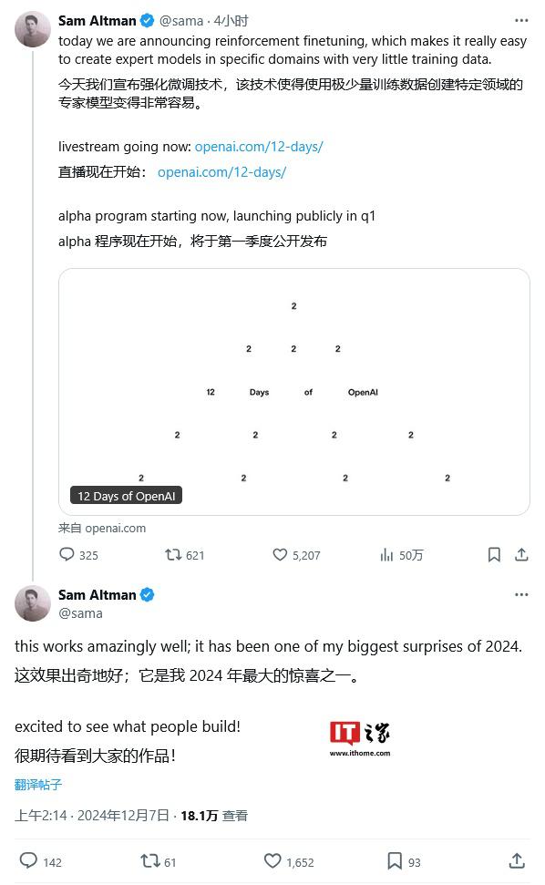 IT 世家 12 月 7 日消息,OpenAI 启动了历时 12 天" shipmas “新产品发布周期,将推出一系列新功能、新产品及相关演示。第二天,OpenAI 引入了强化微调(Reinforcement Fine-Tuning),协助开发者和机器学习工程师为特定复杂领域的任务创建专家模型。