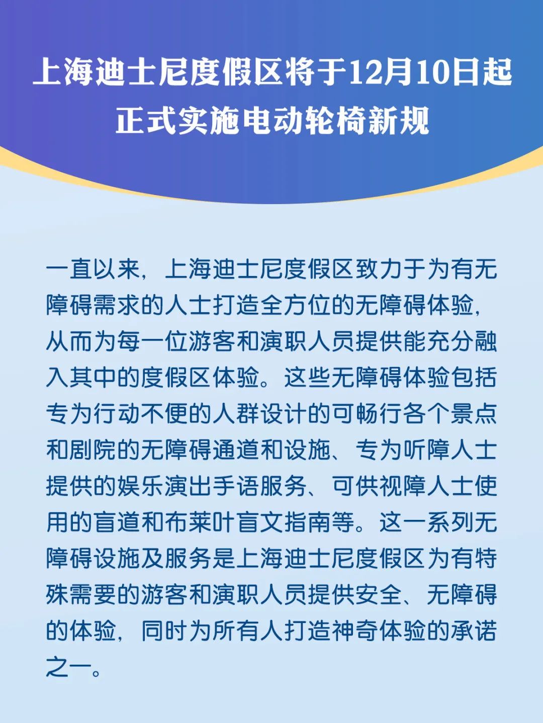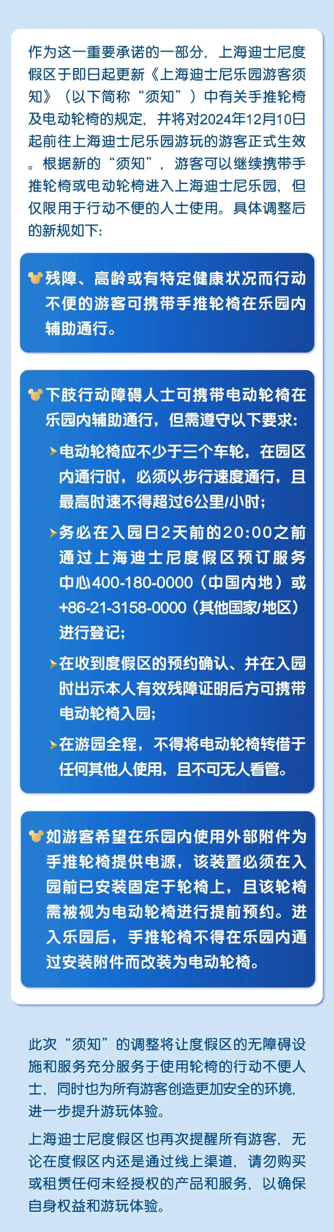 这一“注意事项”的调整将使度假区的无障碍设施和服务充分服务于不方便使用轮椅的人,同时为所有游客创造更安全的环境,进一步提升他们的游玩体验。
