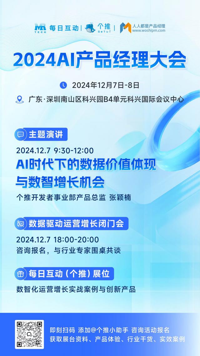 抓住 AI 风口,共探变革机遇。十二 月 7 日 -8 日,AI 深圳将举行产品经理大会。每日互动(个推)将在 7 每天早上带来的游戏《AI “数据驱动运营增长”专题闭门会在当天举行,是时代数据价值体现和数智增长机会的主题演讲。