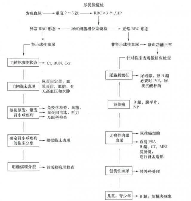 血尿的原因有很多,不同的原因,不同的临床表现,不同的检查结果。如果出现血尿,及时就医,医生会根据病史、体检、辅助检查结果进行综合分析判断。详细步骤见下图 [ 8 ] 。