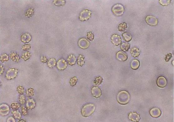 如下图所示,在光学显微显微镜下,红细胞体积略大,大小不一,大部分细胞变皱,车轮锯齿样变化。与尿液密度和渗透压变化有关 [ 6 ] 。