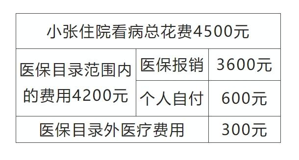 小张在医院住院,总费用为4500元,其中医疗费用为4200元,医疗费用为3600元,医疗费用为300元。