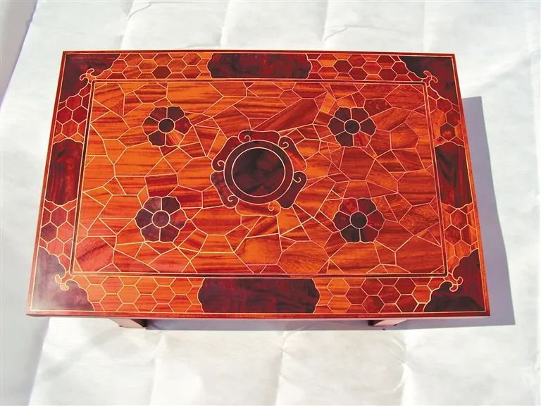 聪明的孟传义反复试制,巧妙利用木材的偏色,精心嵌入条案,寓意“万方安和”。从那以后,独特的技能流入了民间,父母带到了内蒙古呼和浩特,这门手艺传下来了。