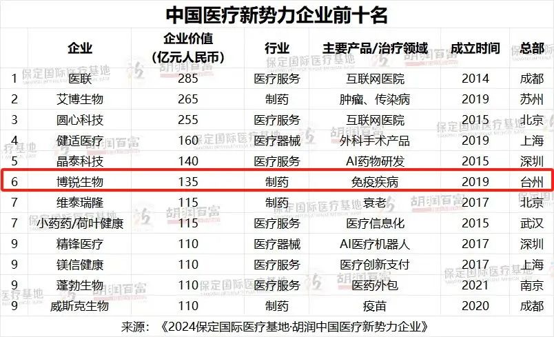 12月5日,胡润研究院发布了来自台州的“中国独角兽”公司博锐生物胡润中国医疗新力量公司名单,排名第六。