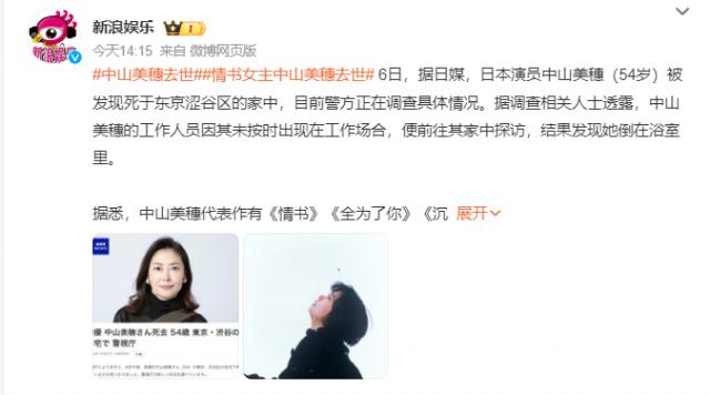 日本女演员中山美穗今早被发现死在家中,享年。 54 岁。