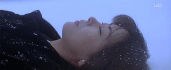 看见中山美穗饰演的博子,身着黑色丧服躺在雪地里,让雪花落在自己的脸上。