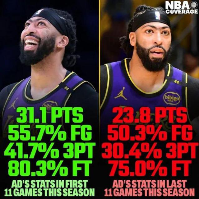 言归正传,现在联盟大概只有一个全明星内线值得勇士交易和机会获得,正处于低谷的浓眉哥,近在咫尺。 7 场比赛有 5 场评分低于 20 分,直接关系到湖人目前混乱的内部状况。