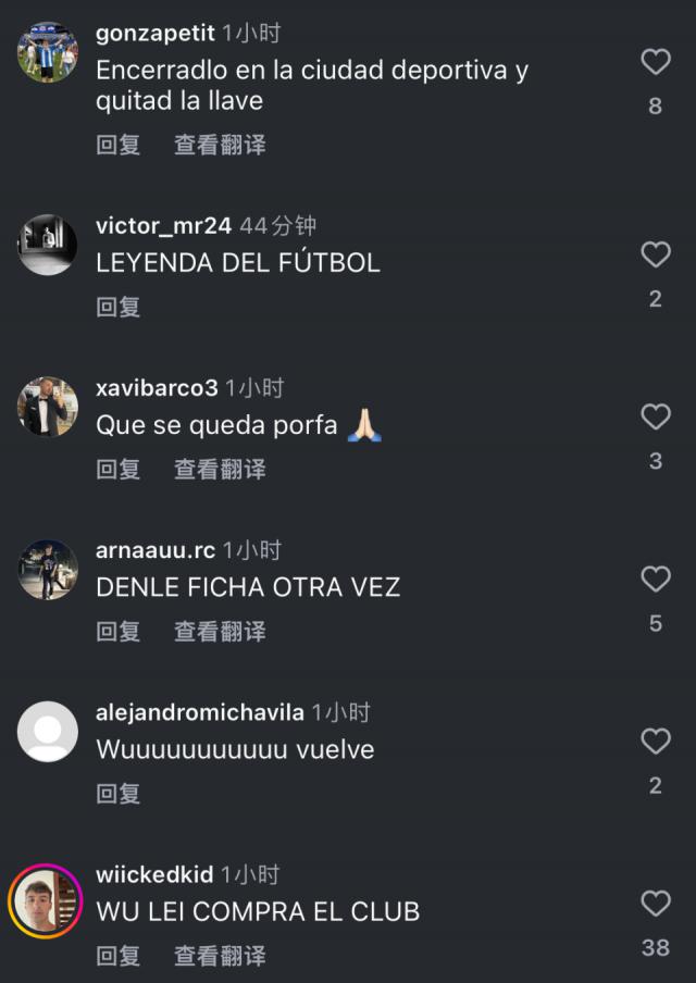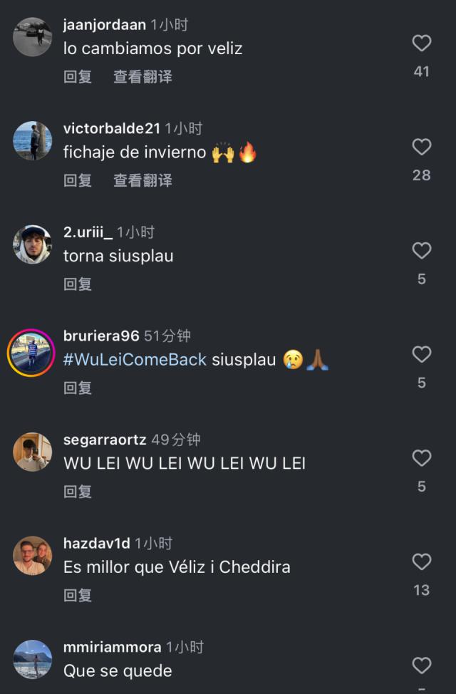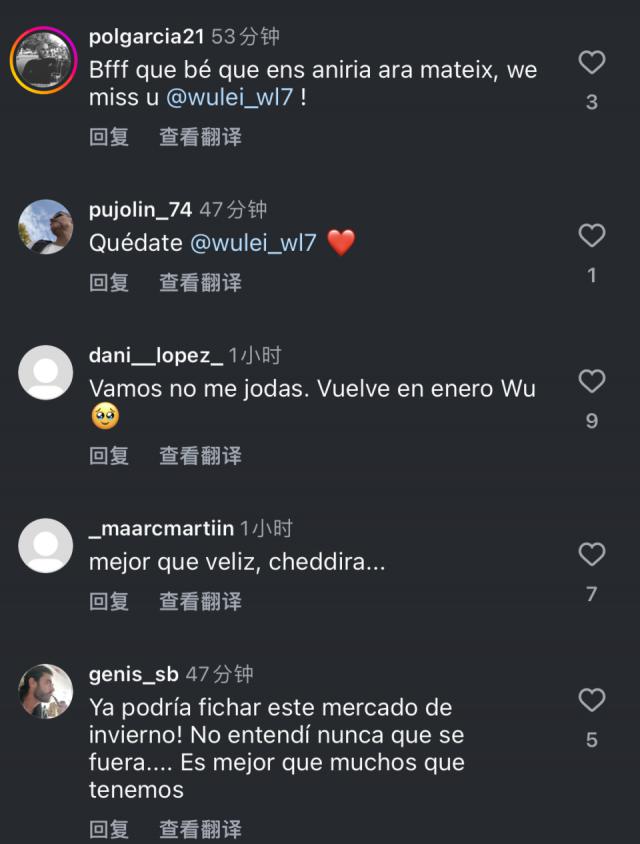 而且很多西班牙人俱乐部的球迷,也纷纷在这个动态评论区用西班牙语表达对武磊的怀念。有几条好评如下:“冬窗签回他吧!";”“请留下他!";”“亲爱的哒武磊,我们想念你,现在你还是那么好!";"武磊现在不回来了,1 月份回到西班牙人身边,这样就可以直接回归加盟!";"把他关进体育城(西班牙人训练中心),然后拿走钥匙,他就走不动了!"
