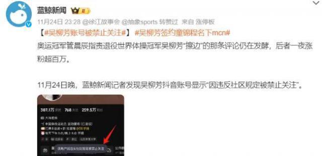11 月 24 日本,吴柳芳的帐户因违反社区规定而被禁止关注。