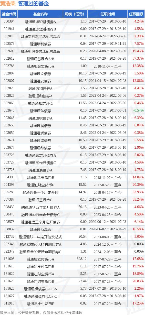黄浩荣先生:中国国藉,厦门大学管理硕士,具有基金从业资格。2014 年 6 每月加入融通基金管理有限公司,曾任固定收益部固定收益研究员、融合通和债券型证券投资基金基金经理 ( 2017 年 7 月 28 日至 2018 年 8 月 10 日 ) 、融合通弘债券型证券投资基金基金经理 ( 2017 年 7 月 28 日至 2017 年 8 月 30 日 ) 、融合通祺债券型证券投资基金基金经理 ( 2017 年 7 月 28 日至 2018 年 9 月 19 日 ) 、融合通宸债券型证券投资基金基金经理 ( 2017 年 7 月 28 日至 2018 年 9 月 19 日 ) 、融合通福债券型证券投资基金 ( LOF ) 基金经理 ( 2017 年 7 月 28 日至 2018 年 8 月 10 日 ) 、融合式短期债券型证券投资基金基金经理 ( 2017 年 7 月 29 日至 2018 年 8 月 10 日 ) 、融合通润债券型证券投资基金基金经理 ( 2017 年 7 月 29 日至 2018 年 9 月 19 日 ) 、融合通玺债券型证券投资基金基金经理 ( 2017 年 7 月 29 日至 2018 年 9 月 19 日 ) 、融通穗债券型证券投资基金主管基金 ( 2017 年 7 月 29 日至 2018 年 8 月 10 日 ) 、融合通颐定期开放债券型证券投资基金基金经理 ( 2017 年 7 月 29 日至 2018 年 8 月 10 日 ) 、融合通昊定期开放债券型发起型证券基金经理 ( 2018 年 4 月 17 日起至 2019 年 10 月 10 日 ) 、融合增利债券型证券投资基金基金经理 ( 2017 年 7 月 29 日起至 2019 年 11 月 21 日 ) ,目前,融通汇财宝货币市场基金主管基金 ( 2017 年 7 月 28 日起至今 ) 、融合易支付货币市场证券投资基金主管基金 ( 2017 年 7 月 29 日起至今 ) 、融通现金宝货币市场基金主管基金 ( 2018 年 11 月 7 日起至今 ) 、融通汇混合型证券投资基金主管基金 ( 2019 年 7 月 20 日至 2024 年 9 月 28 日 ) 、融合通昊三个月定期开放债券型发起型证券基金经理 ( 2019 年 10 月 11 日起至今 ) 、融合新消费灵活配置混合型证券投资基金经理 ( 2020 年 4 月 8 日起至 2023 年 6 月 30 日 ) 。通益混合型证券投资基金经理 ( 2020 年 06 月 02 日至今 ) 。通益混合型证券投资基金经理 ( 2020 年 06 月 02 日至今 ) 。融合通远三个月定期开放债券型证券投资基金基金经理 ( 2020 年 6 月 12 日至今 ) 。融合通安债券型证券投资基金基金经理 ( 2021 年 4 月 15 日至 2024 年 7 月 8 日 ) 。现任融合通跃一年定期开放债券型发起型证券基金经理。