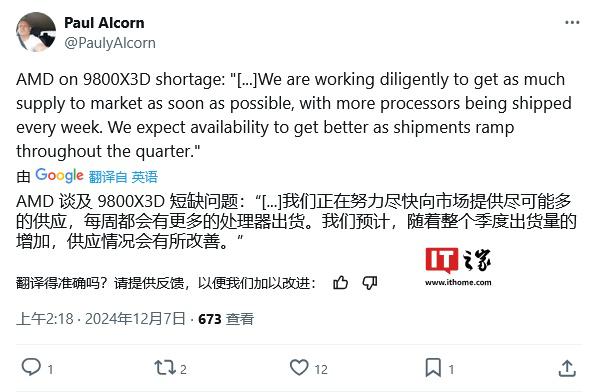 IT 世家 12 月 7 日消息,AMD 9800X3D Cpu供不应求,AMD 承诺增加供应。由于市场需求超出预期,AMD 9800X3D 目前,Cpu面临着严重的缺货问题。AMD 这位官员已经证实,他们正在努力增加产量,并估计下一季度的供应状况将会有所改善。