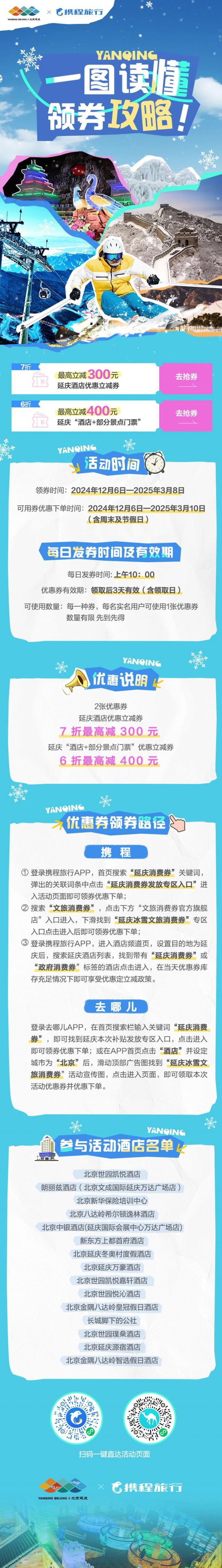 2024 年 12 月 6 日起,上携程和去哪儿 APP/ 小程序预订延庆冬季春季旅游产品享受补贴优惠,包括延庆区部分门票、住宿产品,最高减免 400 元,让你冬春游延庆,玩得开心,住得舒服!