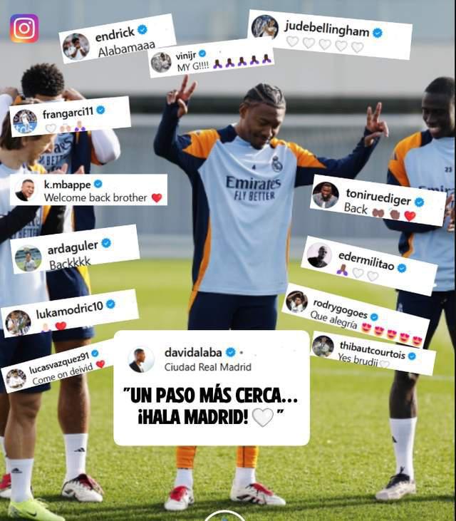 在阿拉巴参加全队合训后,队友们纷纷表示祝贺。韦尼修斯,贝林厄姆,罗德里戈,吕迪格,米利唐,莫德里奇,姆巴佩,库尔图瓦。 …… 很高兴阿拉巴的回归。