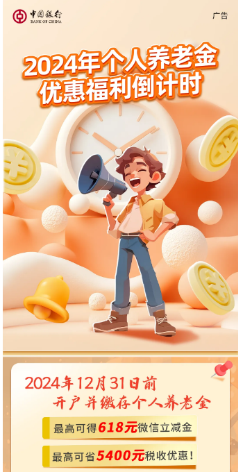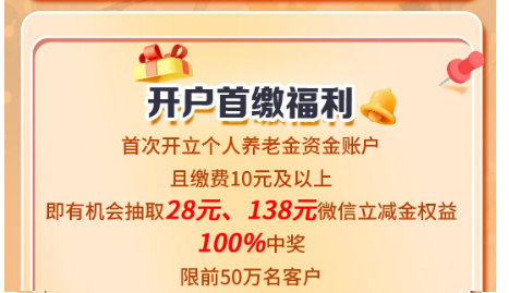 中国银行另一方面,12月31日前开户并缴纳个人养老金的用户, 微信立减金最高可达618元。。其中,首次开户并支付10元以上费用的客户,有机会提取28元、138元的微信减金权益。中国银行还特别标注了“100%中奖”和“限前50万客户”来吸引用户。
