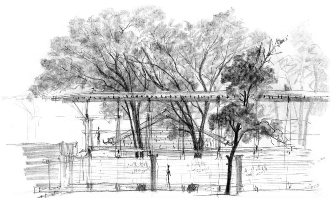 在董功看来,这是两个与树木有关的工程项目,树木与河流、山坡没有区别,是非常具体的环境条件。他认为好的建筑就是要与之产生“敏感”和丰富的关系。这两个项目的基本思路⼀致,即耐心处理场所信息,包括风、光、水、树等珍贵的信息。⾃然而,环境特征将过去所有中国建筑设计推倒“重写”的占领状态,转变为“信息密度加强”状态,相互叠加、补充和对话。