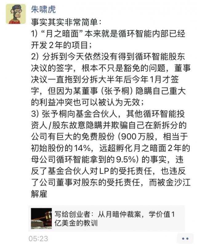 根据朱啸虎的说法,作为张予彤卷入这场风暴中心的根本原因,张予彤向基金合伙人和其他循环智能投资者表示。 / 股东故意隐瞒并欺骗自己在新拆分的企业(即月之暗面)拥有巨额免费股份。这种行为违反了基金合伙人对基金合伙人的要求。 LP 受托责任,也违反了公司董事对股东的受托责任。