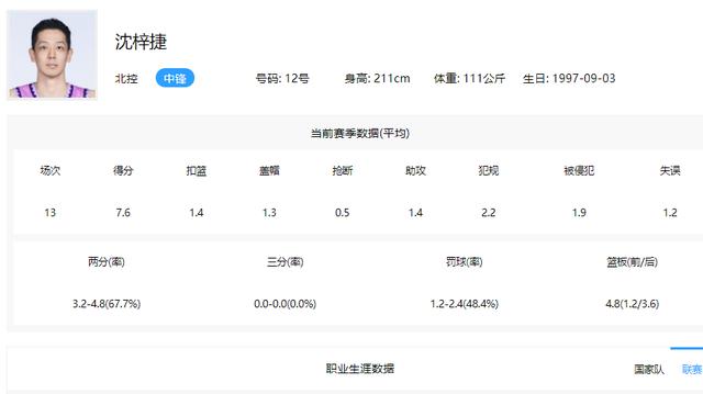 首先,数据平平无奇。十二 第二次出场后,沈梓捷场均只能拿到。 8 分 4.9 篮板 1.3 助攻。