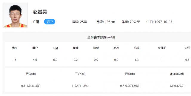 与上赛季相比,赵岩昊本赛季的场均数据大幅下降。上个赛季,他仍然可以在场均上做出贡献。 10.1 分 1.8 篮板 1.3 助攻,这个赛季只能得到。 4.4 分 0.5 助攻上下,投篮命中率,三分命中率都达不到。 4 成功。这种数据,显然达不到顶薪水平。为什么赵岩昊越来越低迷?主要原因是伤病、心理因素、战略地位低下。