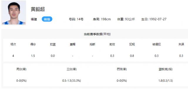 本赛季黄毅超的场均数据是 3 分 3 篮板 0.5 助攻,一名顶薪球员可以打出如此不起眼的数据,真的很抱歉这份高薪合同。