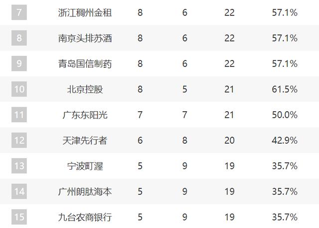 而 16-20 分别是四川、深圳、江苏、上海和福建。这一轮,上海打败了浙江。他们似乎有点势头。让我们看看他们能否继续给后续的惊喜。目前,上海 2 胜,只是 12 的天津也才 6 胜利,这种差距不大。